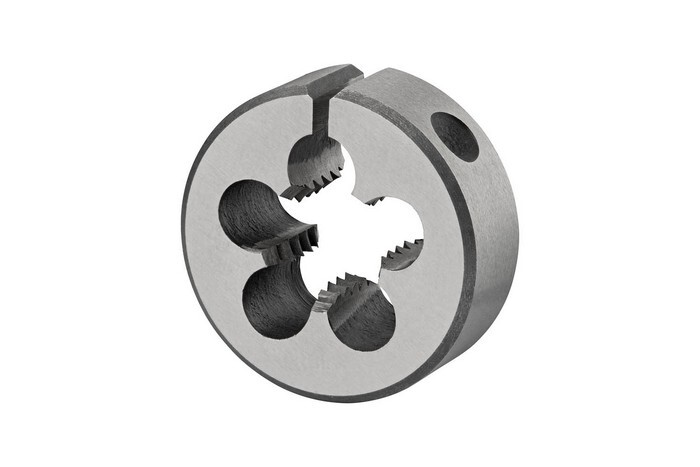 Einstellbares geschlitztes Schneideisen, ISO-Metrisches Gewinde M27 mit 3.00 mm Steigung, um das Drehmoment beim Schneiden von Hand zu reduzieren, können geteilte Schneideisen in kleinen Schritten eingestellt werden, bis zu einem Maximum von ungefähr 0.15mm, Abmessungen nach BS 1127:1950 Standard mit 3" Außendurchmesser und 7/8" Dicke, HSS mit blanker Oberfläche Gewinden in Baustahl und Kohlenstoffstahl, Ferritischer Edelstahl und Grauguss, Temperguss, duktiles und verdichteter Graphitguss